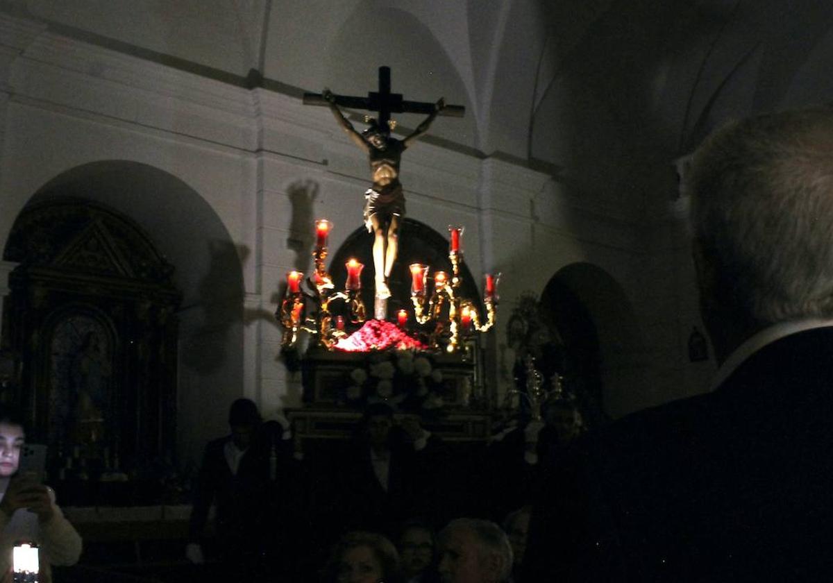 La luz de las doce velas rojas y de un foco que forman parte del paso del Cristo de la Buena Muerte centraron toda la atención durante la velada de recogimiento y luto el día de la muerte de Cristo a la que acudieron numerosos fieles. Además, las 'mecías' de los costaleros en la oscuridad a la imagen y la sombra de la cruz de Cristo, proyectada sobre las bóvedas de la parroquia, crearon un ambiente sobrio. Todo ello, al son de música de capilla y la voz flamenca del cantaor José Dávila, que interpretó un total de cuatro saetas. Primero desde el coro de la iglesia, después desde el Altar Mayor, a continuación desde la capilla y, por último, frente a la imagen de la Virgen de los Dolores.