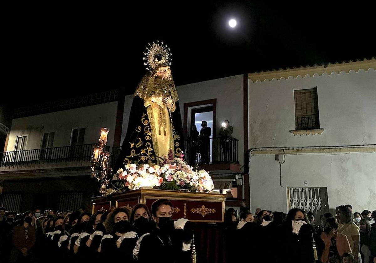 La imagen de la Virgen de la Soledad será la protagonista de la noche del Viernes Santo. Saldrá en procesión del templo parroquial a partir de las 22.00 horas para recorrer las calles Virgen de Gracia, Doctor Alarcón, Primero de Mayo, Eduardo Naranjo, Tentudía, Gallego Paz, Colón, Virgen de Gracia y Parroquia.